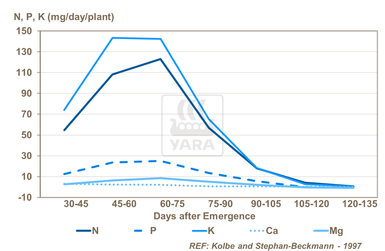 Magneziul este important în stadiul de creştere al cartofului, în special în perioada formării tuberculilor (vezi figura de mai sus). Are de asemenea un rol important în creşterea calităţii corespunzătoare a tuberculului.