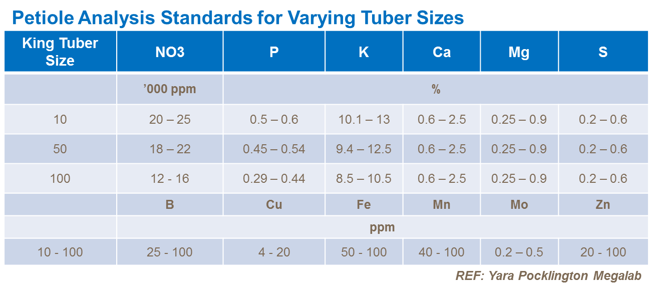 Analiza ţesuturilor (din peţiol sau frunză întreagă) oferă o imagine exactă în perioada de cultivare cu privire la situaţia nutrienţilor plantei, respectiv dereglările şi deficienţele de nutrienţi, în principal probabilitatea carenţelor de microelemente nutritive. Vezi în tabelul de mai jos: