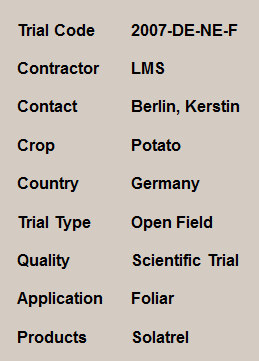 În cadrul unui câmp de testare a soiurilor din nord-estul Germaniei, produsul foliar Solatrel a fost testat pe cartofi de amidon. Testul a fost efectuat timp de trei ani: 2005 - 2007. În la multe soiuri o zonă a terenului a fost tratată de două ori cu 5 l / ha Solatrel. Primul tratament a fost făcut între etapa de începerea formării tuberculilor, al doilea tratament 14-19 zile mai târziu. Zona tratată s-a recoltat manual.