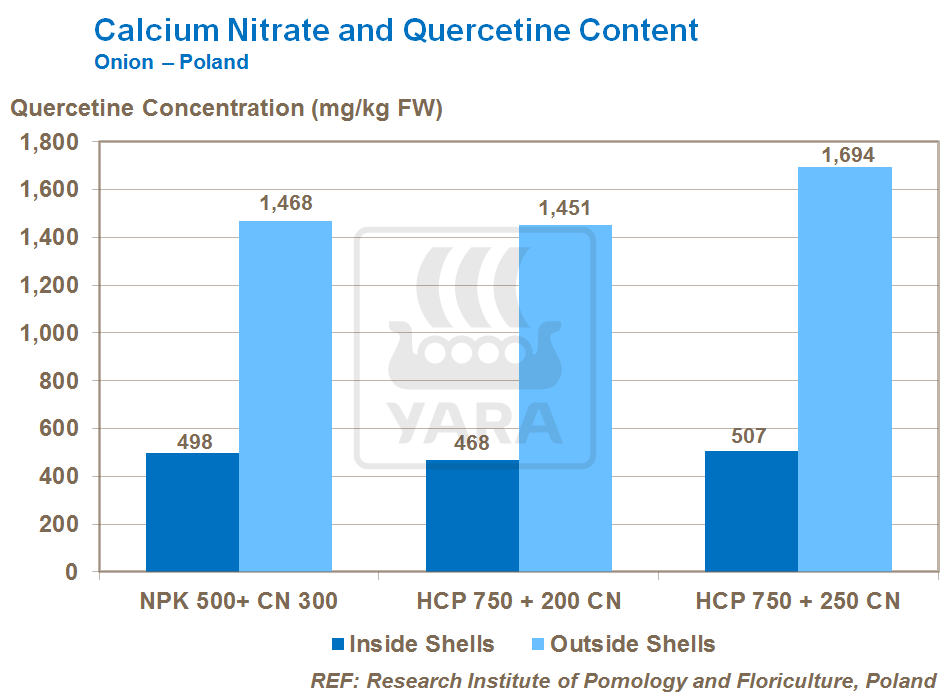 Cercetările au arătat că alimentarea corespunzătoare cu azotat de calciu contribuie şi la creşterea conţinutului de quercetină din bulbul de ceapă. Quercetinul este un pigment galben, care contribuie la creșterea intensităţii culorii cojii şi la îmbunătăţirea proprietăților de depozitare a cepei.