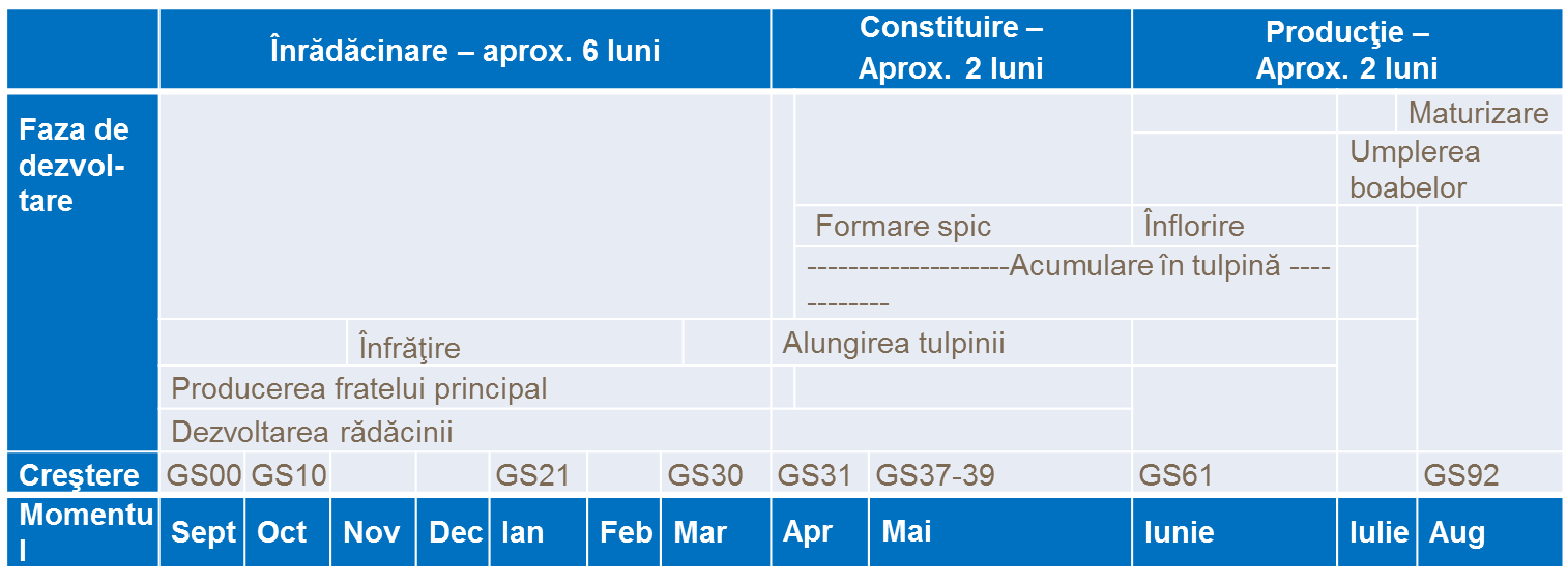Cultura de grâu trece prin trei stadii distincte de dezvoltare de la semănat până la recoltă. Acestea sunt următoarele: