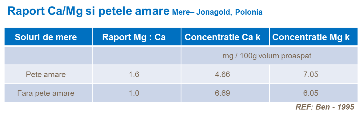 Este necesar prudenţă deoarece excesul de magneziu poate limita absorbţia de calciu şi sporeşte riscul apariţiei petelor amare, aşa cum a fost demostrat de studii din Polonia efectuate în cazul merelor Jonagold.