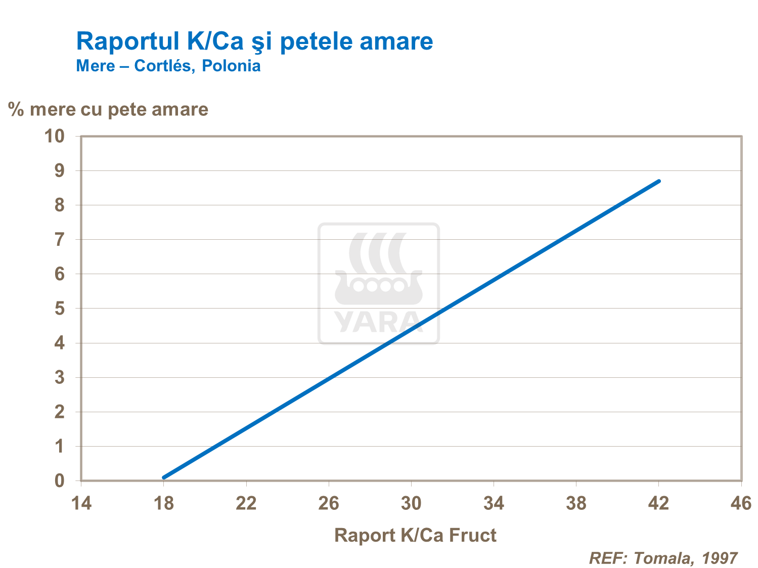 Este acceptat în general o proporţie de Potasiu:Calciu de 15 în cazul fructelor de 40-60 grame, iar în perioada recoltării acesta nu poate fi mai înalt de 30 în scopul reducerii riscul apariţiei petelor amare.