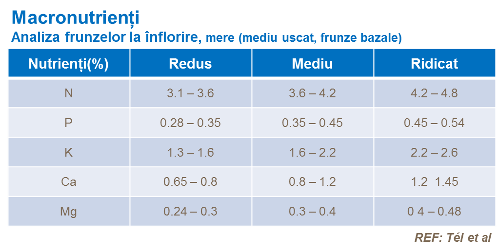 Analiza ţesutului de frunze este o metodă aplicată în cadru mai larg, pentru a primi o informaţie actuală despre starea de nutrienţi în diferite faze de creştere. Valori tipice de analiză a frunzelor pentru creşterea optimă, pentru micro- și macro-nutrienți după etapa de înflorire mai jos.