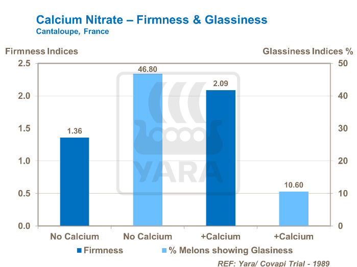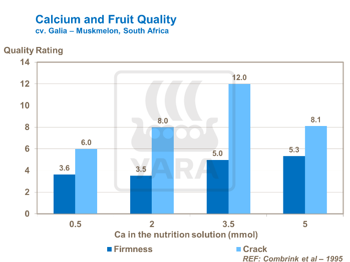 Lipsa fermității fructului de pepene poate fi rezultatul unei alimentări slabe de calciu. Nivelurile ridicate de calciu îngroașă pereții celulari și întărește fructele. Cu toate acestea, calciul trebuie să fie echilibrat cu cantități adecvate de bor pentru a preveni fisurarea. Încercările confirmă faptul că nitratul de calciu este deosebit de eficient pentru a asigura o bună calitate a fructelor.