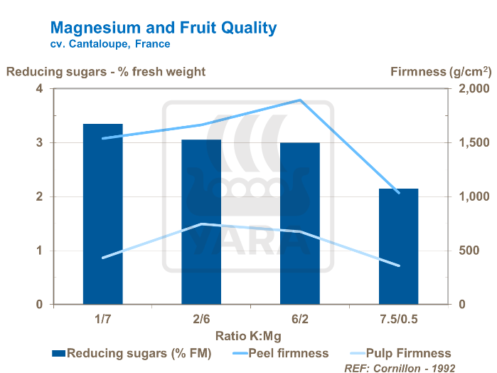 Totuși, absorbția de magneziu poate fi redusă de un exces de alți cationi (potasiu, amoniu și calciu), deci este important să se mențină un echilibru corect pentru a evita compromiterea absorbției. Un dezechilibru al cationilor va reduce fermitatea coajei. Magneziu - în echilibru cu potasiu și calciu - asigură o fermitate bună a pulpei.