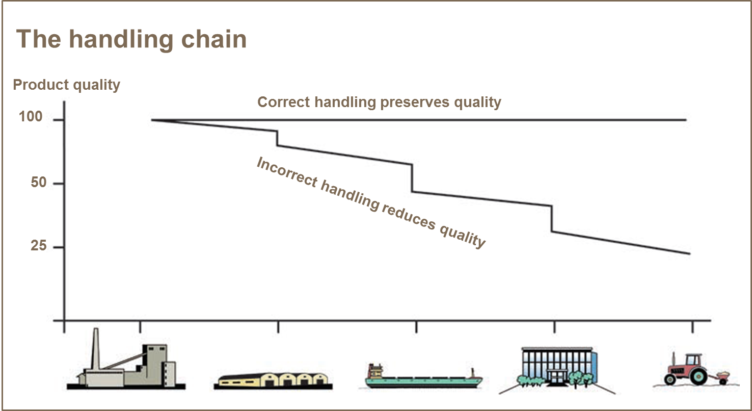 Lanțul de manipulare expune produsele la mai multe etape și solicitări mecanice înainte de a ajunge cu utilizatorul final. Este esențial ca, la livrare, produsul să fie de o calitate satisfăcătoare, să fie aplicat cu ușurință fără a afecta aplicarea acestuia sau producția ulterioară de recoltă.