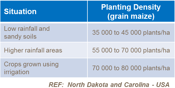 La porumbul cultivat pe terenuri mai secetoase densitatea poate atinge chiar 25.000 de plante/hectar, în timp ce în zonele tropicale cu umiditate mai mare densitatea poate fi de 75.000 plante/ha.