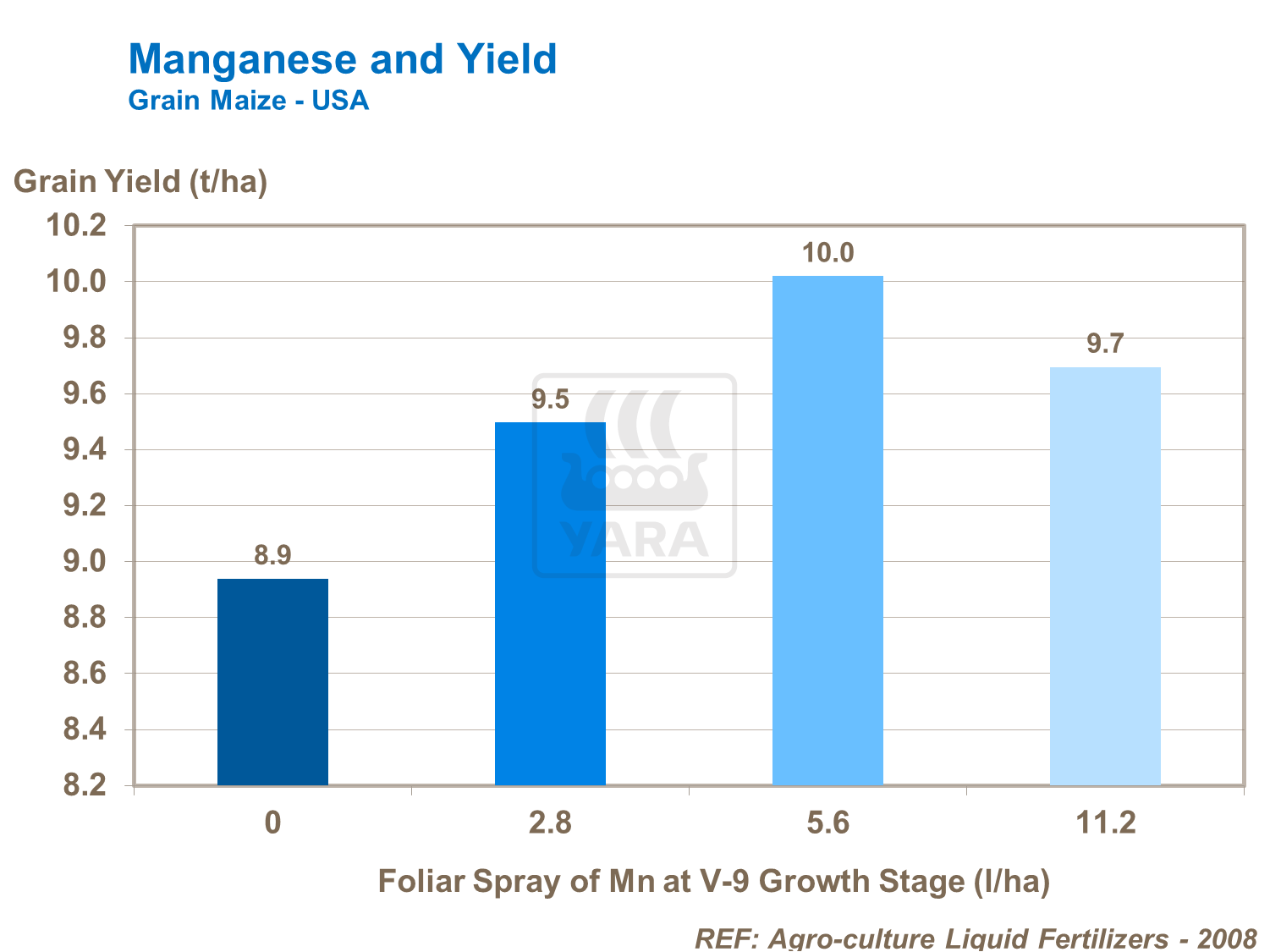 Manganul influenţează în mod direct dezvoltarea şi creşterea plantei. Contribuie la producţia de clorofilă şi la fotosinteză, şi se comportă ca şi catalizator al multor etape de dezvoltare, incluzând metabolismul şi sinteza proteinelor. Manganul se acumulează în mare parte în frunze şi tulpină – în concentraţie mult mai mare, decât alte microelemente. Asimilarea de mangan este progresivă, în special în perioada de creştere vegetativă. În vederea creşterii randamentului se aplică foliar sau la sol.