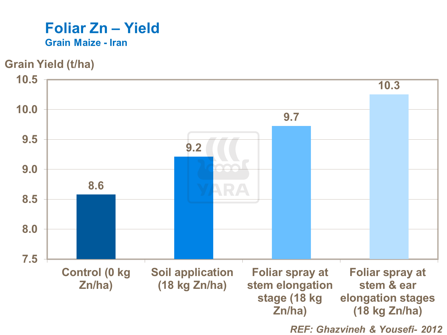 Majoritatea studiilor a arătat o influenţă sensibilă a zincului asupra randamentului. Aplicarea zincului la sămânţă provoacă o reacţie puternică, având efect asupra rădăcini şi vlăstarelor, respectiv asupra creşterii ulterioare a frunzelor. În acelaşi timp un randament ridicat se poate obţine şi prin aplicarea foliară a zincului.