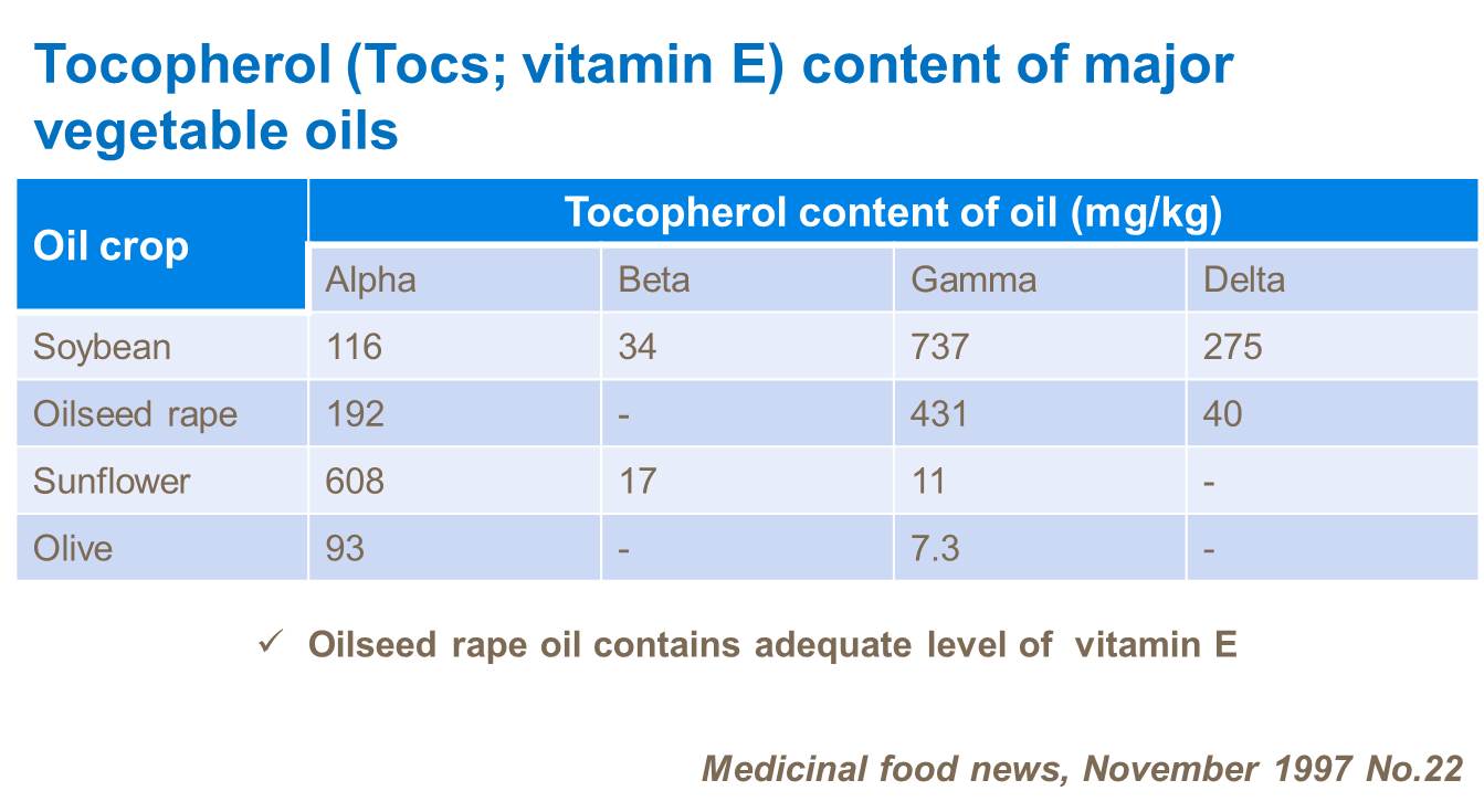 În comparație cu alte uleiuri vegetale, are cel mai scăzut conținut de acizi grași saturați (6 - 8%) din totalul acizilor grași și este bogat în steroli vegetali. Ponderea mare a acidului mono-nesaturat cu 58-60% din totalul acizilor grași. Conținut suficient de acid oleic (20-26%) și acid linolenic (10%) din totalul acizilor grași. Proporția favorabilă a acidului oleic față de acidul linolenic (2,5: 1).