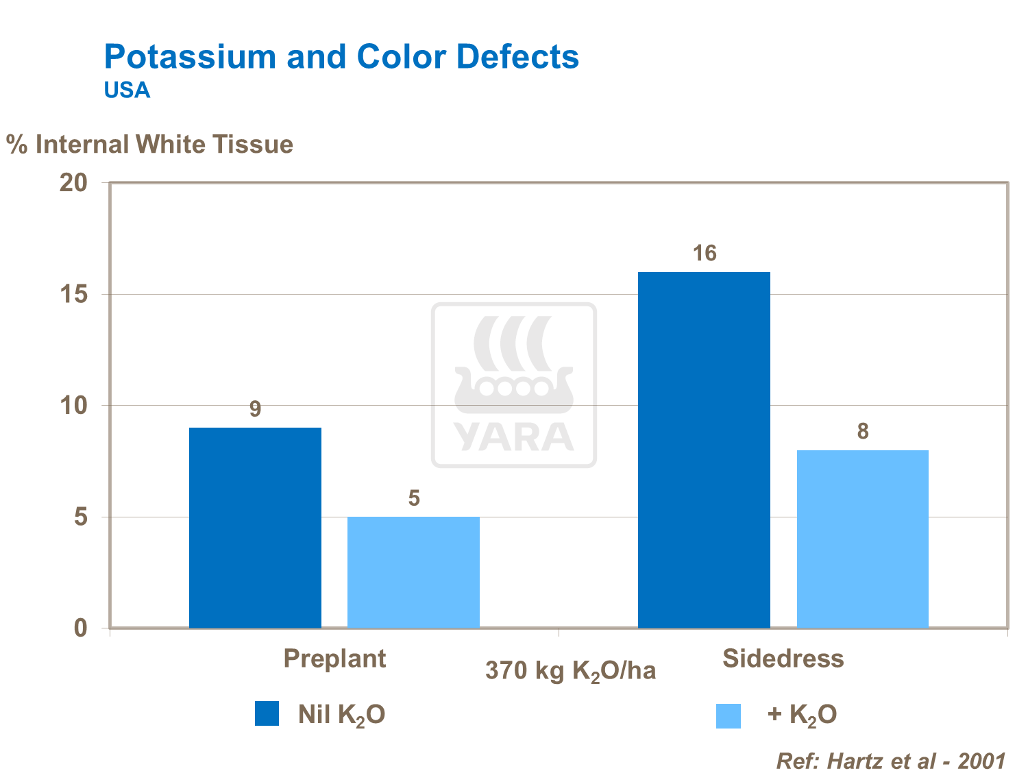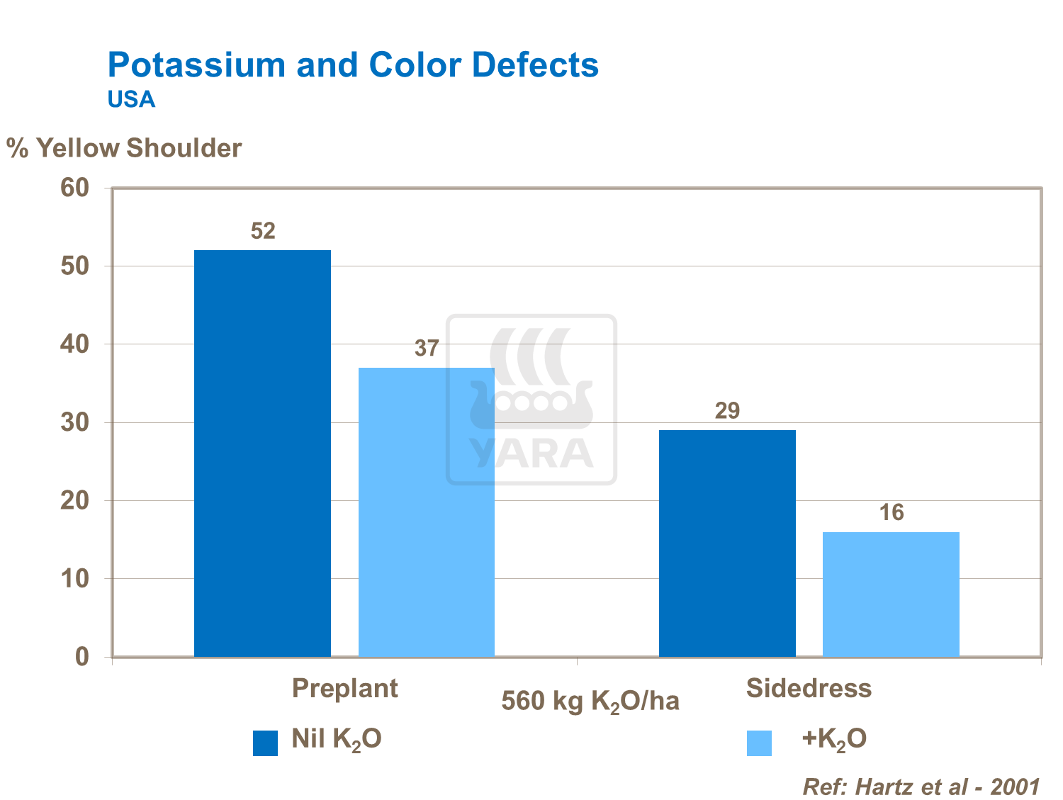 Nivelurile scăzute de potasiu pot duce la o colorare slabă la tomate și la o reducere a sintezei licopenului.