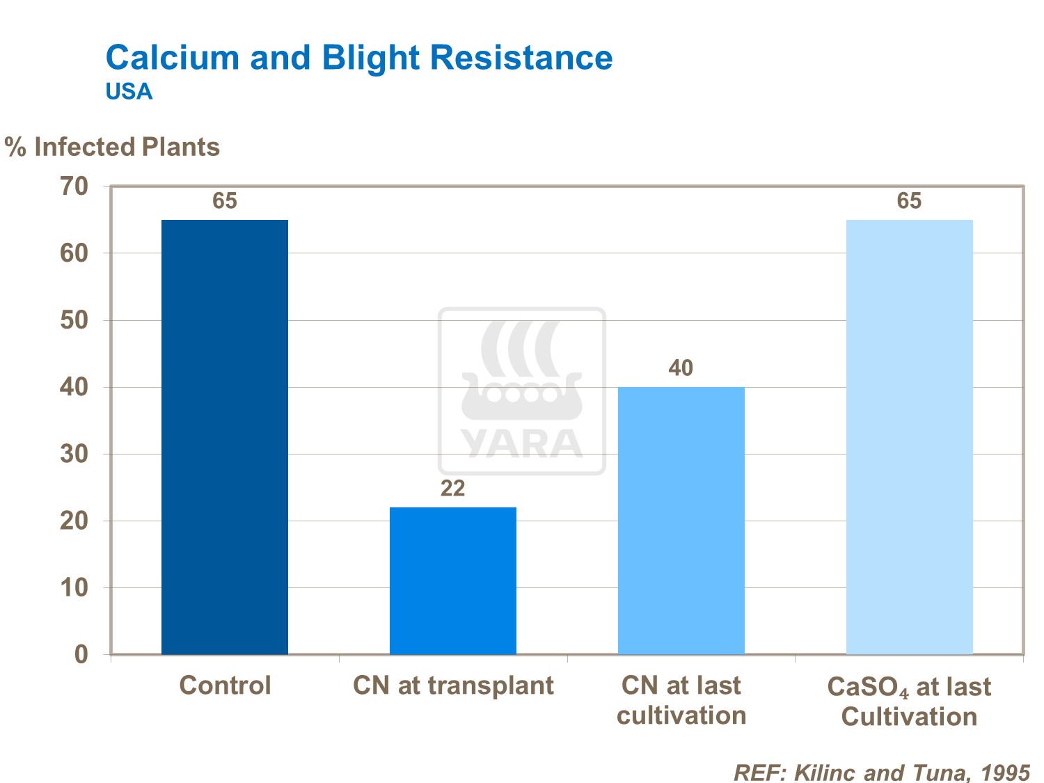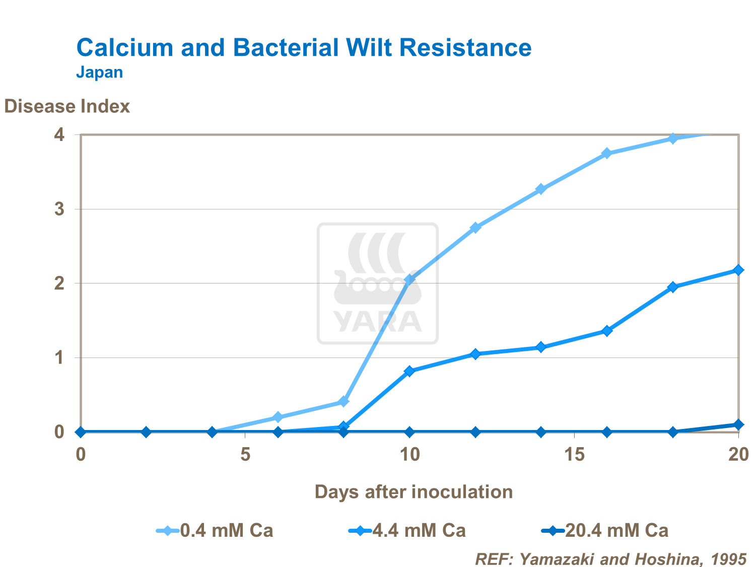 Calciul influențează rezistența la vâsla bacteriană și mâncăria de sud în roșii. Aplicarea mai rapidă solubilă a azotatului de calciu a fost mai eficientă decât sulfatul de calciu (gips).