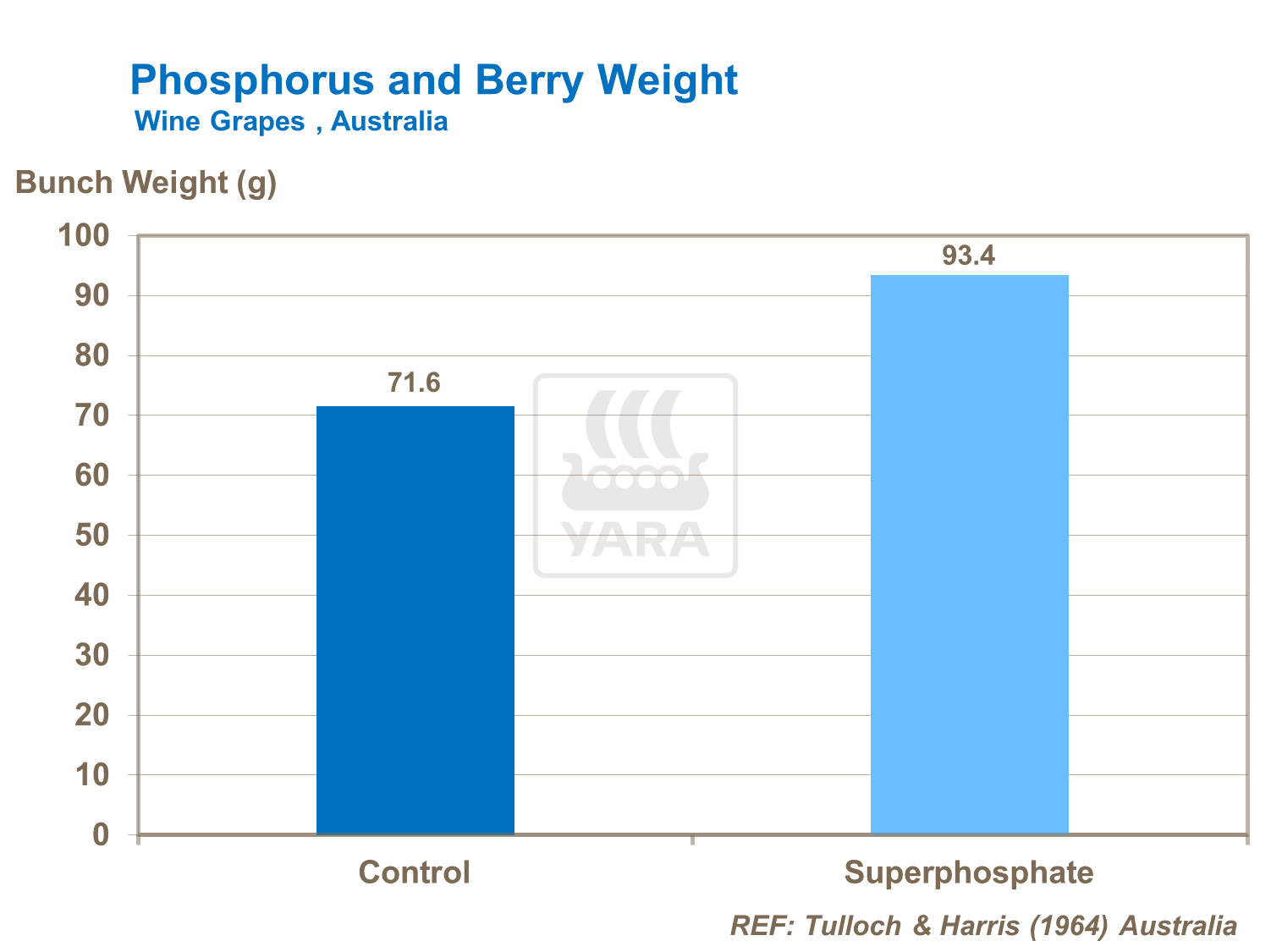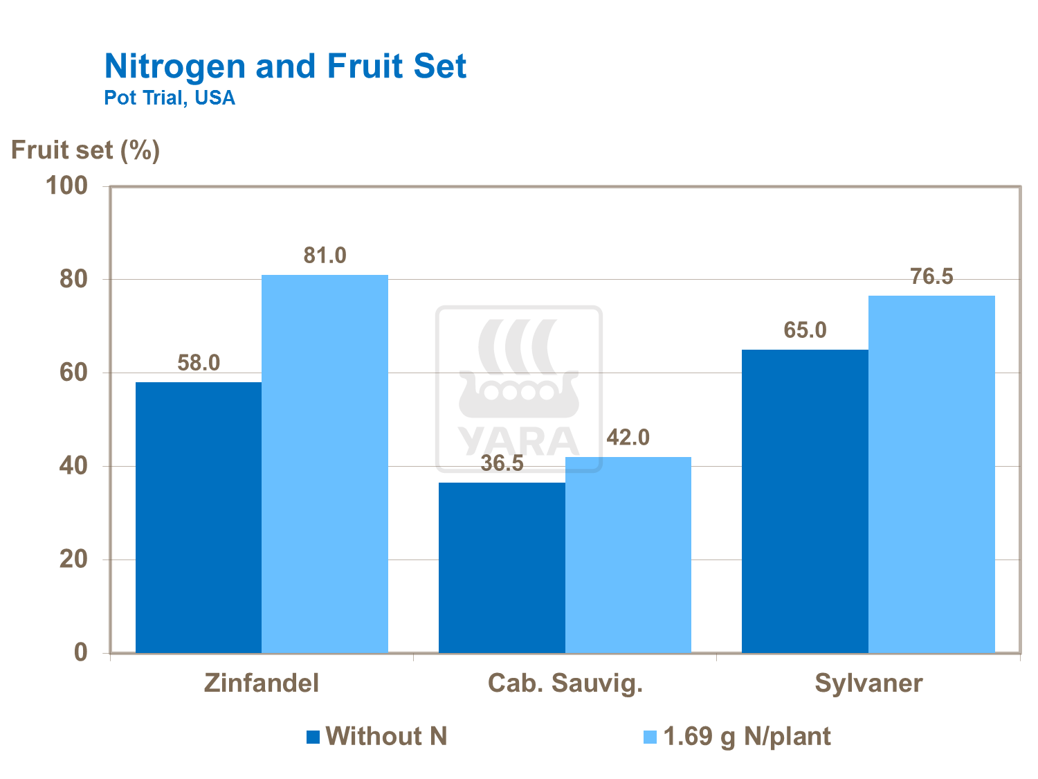 Studiile arată că aplicarea de azot la înflorire măreşte legarea boabelor de struguri de vin. Ratele ridicate de N vor crește randamentul strugurilor de vin. La lucrările lui Nielsen și colab (fig. 16 și 14), răspunsurile la randamentul de N nu au atins apogeul la 300 kg/ha și a existat o corelație similară cu greutatea ciorchinilor de struguri în doi din cei trei ani din aceste studii.