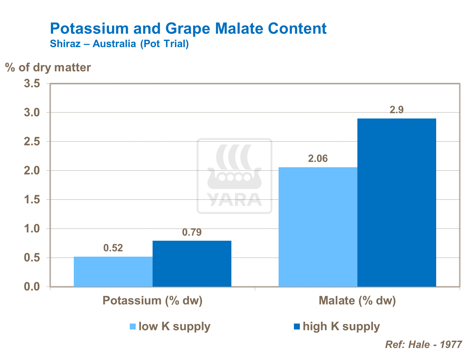 Nutritia culturilor este foarte importantă pentru formarea acizilor malic și tartric. Aplicările de potasiu servesc la creșterea concentrației de malat și potasiu în boabe.