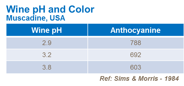 Valorile ridicate ale pH-ului pot, de asemenea, să modifice culoarea soluțiilor de antociani - responsabile pentru culoarea vinului roșu - prin schimbarea structurii moleculei de antociani, care devine mai albastră și deci mai puțin de dorit.