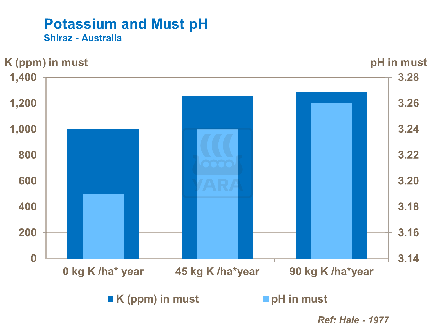Cantitatea excesivă de potasiu poate crește pH-ul strugurilor care influențează antocianii, reducând intensitatea colorării roșii. Potasiul are un efect direct asupra nivelului de pH al mustului.