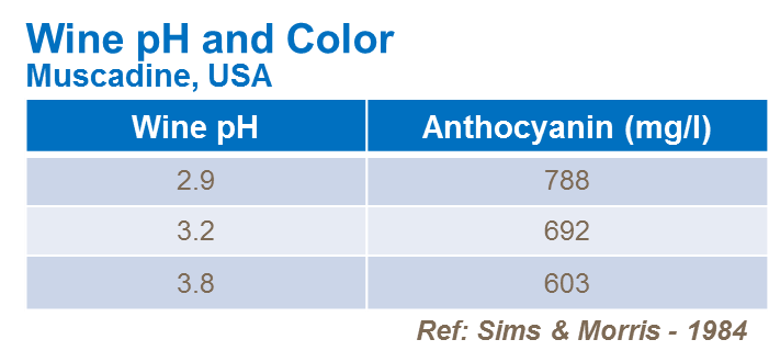 Astfel, este important să se obțină echilibrul adecvat al potasiului în struguri. În Franța, de exemplu, nivelurile de potasiu acceptate în mustul vinurilor franceze se situează între 1-2,5 g/l, rezultând în vinul final 0,7-1,6 g/l. Valorile ridicate ale pH-ului pot, de asemenea, să modifice culoarea soluțiilor de antocianină - responsabile pentru culoarea vinului roșu - prin schimbarea structurii moleculei de antocianină, care devine mai albastră și prin urmare mai puțin de dorit.