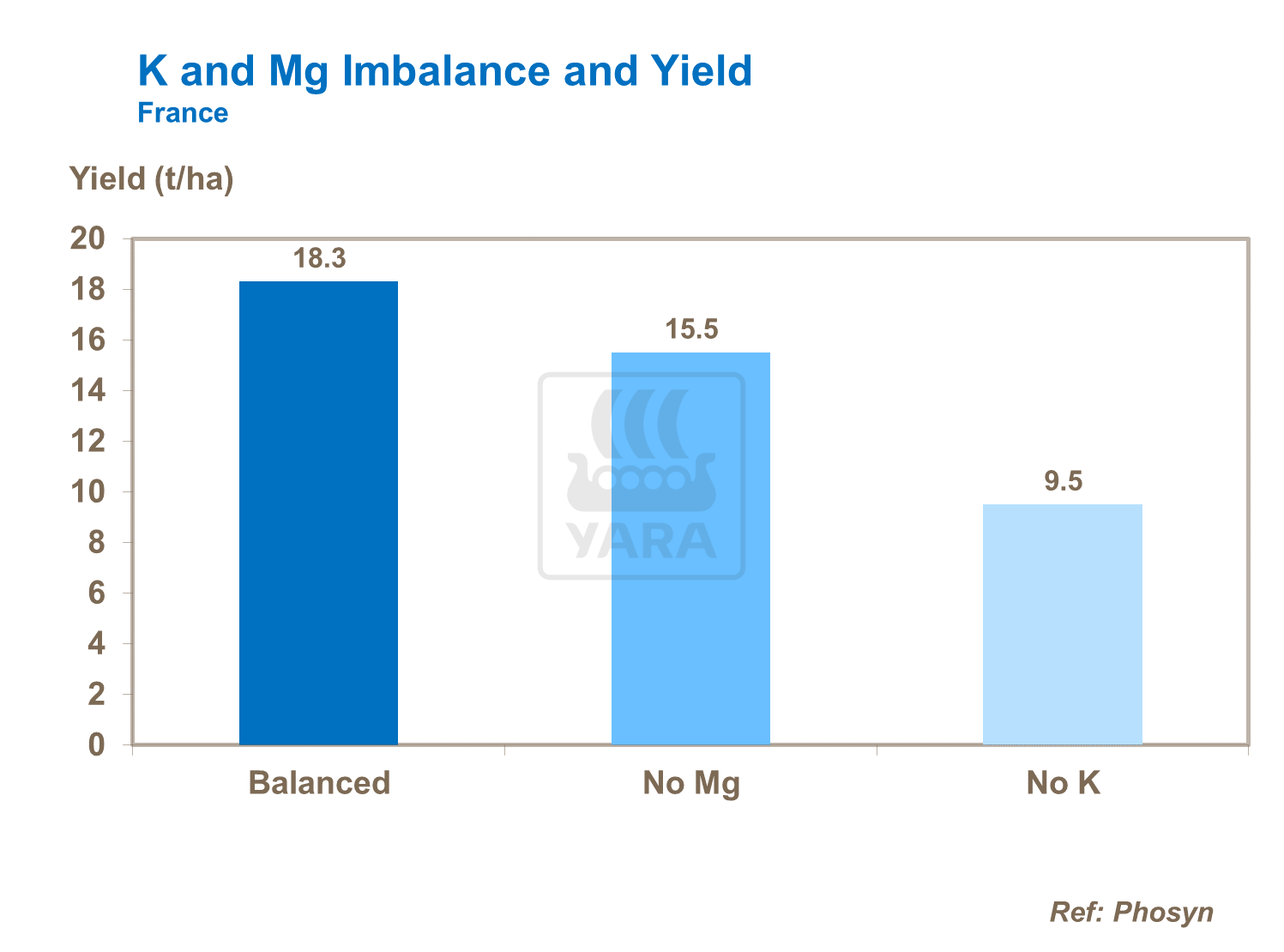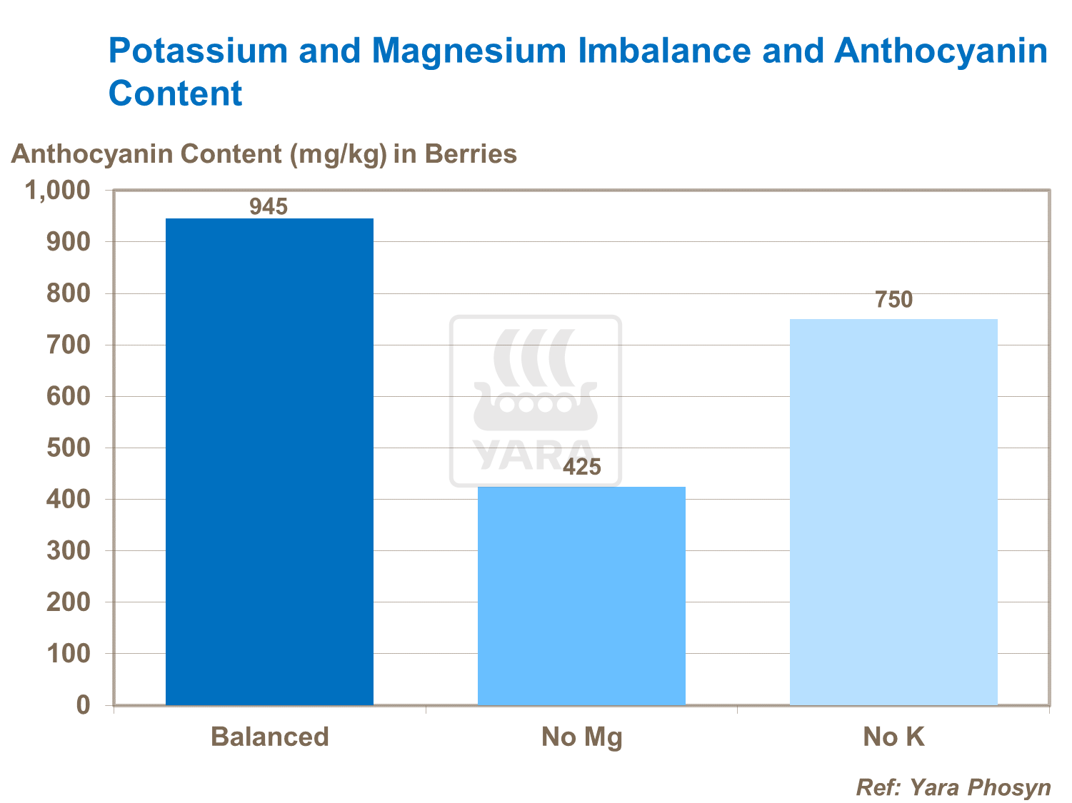 Deficitul de magneziu poate duce la căderea prematură a fructelor la recoltare și în timp ce aplicarile foliare pot corecta deficiențele în sezon - randamentul strugurilor poate fi deja pierdut ca urmare a unui echilibru slab K:Mg (Figura 8). Magneziul aplicat la sol este cea mai bună strategie pe termen lung pentru a se asigura că acest element nu este limitat. Cerințele viței de vie pentru fosfor sunt mult mai mici, iar programele minime de întreținere sunt tot ceea ce este adesea necesar.
