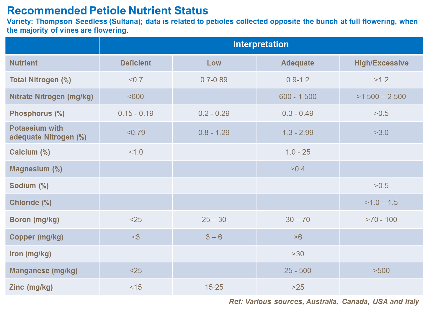 Analiza plantelor oferă o evaluare mai precisă și imediată a stării nutritive a viței de vie (Tabelul 6). De asemenea, va confirma deficiențele ascunse în care simptomele plantelor nu au fost încă văzute și să identifice cu exactitate echilibrul dintre elementele necesare.