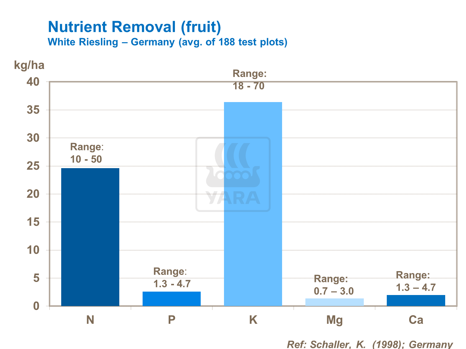 Potasiul este important pentru dezvoltarea fructelor și producția de boabe. În general, este necesar în cantități mai mari decât azotul și adesea aplicat in perioade similare. Preluarea potasiului în struguri este, de asemenea, mai mare decât cele pentru majoritatea celorlalte elemente (Figura 7).